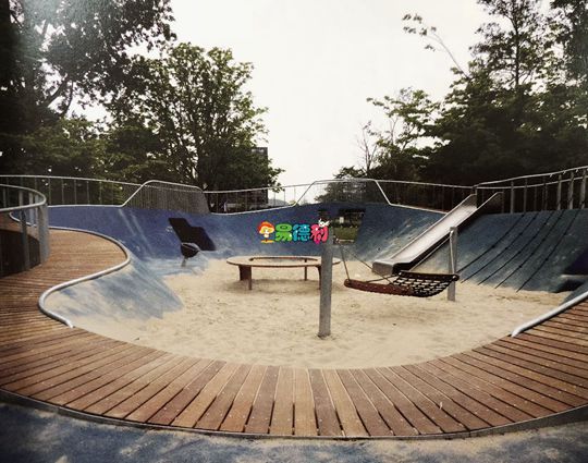 游樂(lè)場(chǎng)由上升的環(huán)形物體構(gòu)成,不僅提供了曲線通向滑道,同時(shí)也構(gòu)成了一個(gè)兩邊都可以攀爬的邊緣。垂直的外墻是由鉆有孔眼和圓形攀爬拉環(huán)的條形木塊構(gòu)成。環(huán)形物體內(nèi)部由藍(lán)色的波浪形斜坡和沙坑組成。這個(gè)區(qū)域的幾個(gè)通道為兒童提供玩耍和休息的空間,同時(shí)也為那些有缺陷的兒童提供了一個(gè)隱蔽的地方。用于攀爬的木墻適合每一個(gè)兒童,依靠自己的力量、采用不同的方式都有可能得到玩耍的機(jī)會(huì)。在環(huán)形物體周?chē)蜕厦娑加袑掗煹目臻g,適合一些積極的、重復(fù)移動(dòng)的活動(dòng)(轉(zhuǎn)彎、滑行、跳躍、搖擺),建造活動(dòng)(沙子) 以及幻想游戲(隧道、平臺(tái)、遮蓋物) 等。