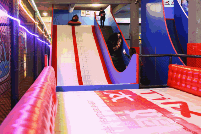 當(dāng)然,室內(nèi)的旱雪滑梯沒有那么多能力技術(shù)上的要求,只要你敢嘗試,就會享受飛一般的感覺,坐著的橡皮膠墊會沿著軌道飛出最后落到充氣氣墊之上,過程中享受旱雪滑梯帶來的沖刺感,期間總能聽到玩者的尖叫聲,成為蹦床樂園的一大亮點(diǎn),是目前抖音上最火熱的娛樂項(xiàng)目之一——網(wǎng)紅尖叫滑梯